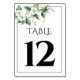 This sophisticated wedding table number card showcases a beautiful combination of sage green greenery and white flowers. In the upper left corner, a graceful branch embellished with white flowers and sage green leaves creates a captivating focal point. The text on the card is presented in a bold and eye-catching typography, further enhancing the overall elegance of this design.