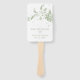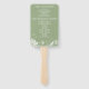 Branch with sage green flowers wedding program Hand Fan. This special hand fan design for a wedding is truly unforgettable, boasting a beautiful ethereal floral arrangement with sage green and white flowers as the focal point. The tender and elegant look is ideal for a special day. On the reverse side, the same floral display is showcased in white against a green background.