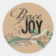 Christmas holiday stickers with a natural, simple look, features a tan kraft paper look background with black typography text that reads Peace & Joy and a sprig of branches and berries tied up with ribbon!