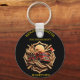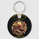 This custom keychain features a Fire Department's Badge of Honour design, set against a striking black and red background. The badge is adorned with two fire axes, symbolising bravery and heroism, and is held by a silhouette of a fireman in action.