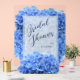 Beautiful blue hydrangea flowers bridal shower welcome sign. Big acrylic sign to personalise with bride's name. Perfect, realistic flowers, from the Bravest Blue design line, are the background for big "Bridal Shower" text with smaller text for the name. This sign size is 18 x 24 inches, with other sizes available.