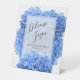 Wedding guest book sign. Beautiful blue hydrangea flowers decorate this pedestal sign. More sizes are available. Personalise with names of the couple and set on the guest book table. The beautiful light blue floral design is part of the Bravest Blue design line.