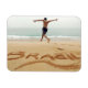 COPYRIGHT Stephanie Rabemiafara / DanitaDelimont.com | AF36 SRA0000.jpg | BRAZIL. Barechest man wearing a swimming suit jumping on the sand over the name Brazil written in the sand, jumping towards the sea