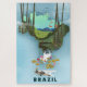 Brazil map Illustrated travel poster of the Amazon rainforest landscape and a small light aircraft plane.
