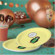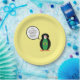 Ms. Penguin enjoyed her travels in Brazil. She proudly wears a vest of the green, blue, yellow, and white Brazilian flag. On these paper party plates, she models the flag with a talk bubble. Change the words in her talk bubble to a message for your party guests. If you wish, change the background colour of the party plates to match the theme or your home decor.