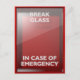 An empty red emergency box with an in case of emergency breakable glass on the front