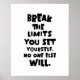 Push beyond your boundaries with this powerful motivational poster featuring the bold statement, "Break the Limits You Set Yourself. No One Else Will." The eye-catching typography and impactful message are perfect for reminding you that self-imposed limits are meant to be shattered. Ideal for personal spaces, offices, gyms, or anywhere you need a boost of confidence and determination. A great piece for inspiring yourself and others to take control and rise above challenges.