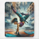 The design shows a lively scene in which a break dancer women performs in full swing on the street. The main character, the break dancer, is in the middle of a powerful handstand.