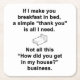 For the sarcasm lover in all of us.  Check out this witty “If I Make You Breakfast in Bed a Simple Thank You is all I Need.  Not All This How Did You Get in my House Business” design on apparel and gifts.