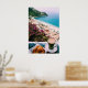 This photograph of breakfast with a Mediterranean coastal view shows a coffee and croissant being enjoyed in the relaxing Italian town of Scilla, Calabria.