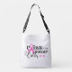 This cross-body tote bag is shown in a breast cancer awareness pink ribbon print.