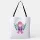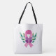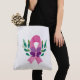 This tote bag is shown in a breast cancer awareness pink ribbon and butterfly art print.