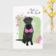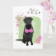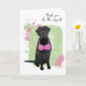 Black labrador retriever dog wearing a pink bra with hearts for thank you from a breast cancer survivor.