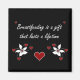This magnet features white text reading Breastfeeding is a gift that lasts a lifetime decorated with hearts and flowers on a black background.