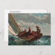 A fine art postcard with the painting by Winslow Homer, an American artist (1876) from the realism movement, Breezing Up (1873-1876), also known as Fair Wind. A group of boys in a sailboat on the ocean named Gloucester, letting wind in the sails.