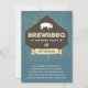 This rustic guys surprise birthday party invite has a "Brew and BBQ" theme with a unique vintage-style beer label logo. The muted blue, brown, and yellow colour palette adds to the modern vintage look. The design also features distressed typography, a white pig, a light yellow sunburst, and a yellow sketched banner.