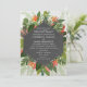 A wedding rehearsal dinner invitation featuring an illustration of a chalkboard inspired hexagon at centre over tropical botanical design with a white brick background and reverse.