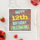 This fun birthday-themed paper napkin design features a message like "HAPPY 12th BIRTHDAY, FIRSTNAME!", where the name can be personalised. The background features a representation of a brick wall consisting of some reddish-brown coloured bricks. The customisable message text features colours like blue, yellow, and green, and it has an appearance inspired by that of painted graffiti. Napkins like these could perhaps be used at a birthday party for somebody who is celebrating their twelfth birthday. [~Z0000271]