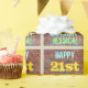 This fun birthday-themed wrapping paper design features a message like "HAPPY 21st BIRTHDAY, JESSICA!", where the name can be personalised. The background features a representation of a brick wall consisting of some reddish-brown coloured bricks. The customisable message text features colours like blue, yellow, and green, and it has an appearance inspired by that of painted graffiti. Wrapping paper like this could perhaps be used when wrapping birthday gifts being given to somebody who is celebrating their twenty first birthday. [~Z0000274]