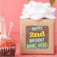 This fun birthday-themed sticker design features a message like "HAPPY 2nd BIRTHDAY, NAME-HERE!", where the name can be personalised. The background features a representation of a brick wall consisting of some reddish-brown coloured bricks. The customisable message text features colours like blue, yellow, and green, and it has an appearance inspired by that of painted graffiti. Stickers like these could perhaps be given as a birthday gift, or perhaps be used as decorations at a birthday party for somebody who is celebrating their second birthday. [~Z0000273]