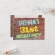 This fun birthday party invitation design features a message like "STEPHEN’S 31st BIRTHDAY PARTY!", where the name can be personalised, on the front. The background features a representation of a brick wall consisting of some reddish-brown coloured bricks. The customisable message text on the front features colours like blue, yellow, and green, and it has an appearance inspired by that of painted graffiti. The back features a customisable message that could include relevant details about the birthday party. Birthday party invitations like this might be a fun way to invite family and friends to a birthday party being held for somebody who is celebrating their thirty first birthday. [~Z0000287]