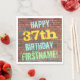 This fun birthday-themed paper napkin design features a message like "HAPPY 37th BIRTHDAY, FIRSTNAME!", where the name can be personalised. The background features a representation of a brick wall consisting of some reddish-brown coloured bricks. The customisable message text features colours like blue, yellow, and green, and it has an appearance inspired by that of painted graffiti. Napkins like these could perhaps be used at a birthday party for somebody who is celebrating their thirty seventh birthday. [~Z0000271]