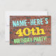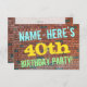 This fun birthday party invitation design features a message like "NAME-HERE’S 40th BIRTHDAY PARTY!", where the name can be personalised, on the front. The background features a representation of a brick wall consisting of some reddish-brown coloured bricks. The customisable message text on the front features colours like blue, yellow, and green, and it has an appearance inspired by that of painted graffiti. The back features a customisable message that could include relevant details about the birthday party. Birthday party invitations like this might be a fun way to invite family and friends to a birthday party being held for somebody who is celebrating their fortieth birthday. [~Z0000287]