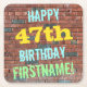 This fun birthday-themed coaster design features a message like "HAPPY 47th BIRTHDAY, FIRSTNAME!", where the name can be personalised. The background features a representation of a brick wall consisting of some reddish-brown coloured bricks. The customisable message text features colours like blue, yellow, and green, and it has an appearance inspired by that of painted graffiti. Coasters like these might be useful as practical decorations at a birthday party for somebody who is celebrating their forty seventh birthday. [~Z0000288]