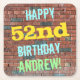 This fun birthday-themed coaster design features a message like "HAPPY 52nd BIRTHDAY, ANDREW!", where the name can be personalised. The background features a representation of a brick wall consisting of some reddish-brown coloured bricks. The customisable message text features colours like blue, yellow, and green, and it has an appearance inspired by that of painted graffiti. Coasters like these might be useful as practical decorations at a birthday party for somebody who is celebrating their fifty second birthday. [~Z0000288]