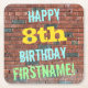 This fun birthday-themed coaster design features a message like "HAPPY 8th BIRTHDAY, FIRSTNAME!", where the name can be personalised. The background features a representation of a brick wall consisting of some reddish-brown coloured bricks. The customisable message text features colours like blue, yellow, and green, and it has an appearance inspired by that of painted graffiti. Coasters like these might be useful as practical decorations at a birthday party for somebody who is celebrating their eighth birthday. [~Z0000288]