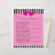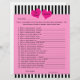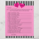 This fun bridal or wedding shower game makes a great addition to a bridal or wedding shower. The design features black and white stripes as the backdrop with two pink hearts at the top. One heart says "Who Knows" and the other heart says the name of the bride (which you can customise) on the design. There is a place for the name of the party guest, game instructions and 20 questions about the bride. The idea is to see who knows the most about the bride with the person who gets the most points winning the game. The great thing about this bridal shower game is you can customise it with the name of the bride and you can customise it with the bride's colour as the background for the questions...to do this just click edit and choose a background colour. This bridal shower game design is featured on linen paper to make a beautiful look for a bridal shower, but comes in other papers as well. A fun and unique game addition to your bridal shower. Copyright henishouseofpaper