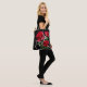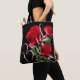 Red roses large tote bag with "bride" text angled on the front. Dark green with realistic red rose stems with leaves on both sides. Wording is on one side only.
