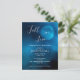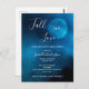 A romantic invite card for a rustic bridal shower . A dark blue evening and night with a full moon. With the text: Fall in Love. Templates for date, name, event place, and RSVP details. The name is written with a modern hand lettered style script. White letters.