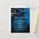 A romantic invite card for a rustic bridal shower . A dark blue evening and night with a full moon and string lights. Two rustic painted mason jars with candles. Templates for date, name, eventplace, and RSVP details. The name is written with a modern hand lettered style script. White letters.