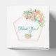 A trendy and elegant favour box for a bridal shower. Decorated with a simple copper coloured geometric frame. With a bouquet of roses in white, blush pink and coral With some green foliage. Elegant white background. Templates for the bride's name. With the text on front and back: Bridal Shower written with a hand lettered style script. Green coloured letters. The text on top: Thank You!