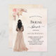 A rose gold, blush pink gradient background. A bride, pink roses, pampas grass. Personalise and add a name and party details.