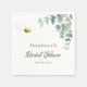 A chic white background decorated with green watercolored eucalyptus greenery, leaves and sprigs and a cute happy smiling bumble bee. Personalise and add the name of the bride to bee and the date. Black coloured letters. The text: Bridal Shower is written with a trendy hand lettered style script.