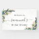 For an modern an elegant Bridal Shower. A chic white background. Decorated with green watercolored eucalyptus leaves, sprigs, greenery and a faux gold leaves. Personalise and add a name. With the text: Welcome to and Bridal Shower. Can be used as a welcome banner or as party wall decoration.