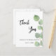A thank you card for a Bridal Shower. A chic white background decorated with eucalyptus greenery. On front large black coloured hand lettered script and the text: Thank You, your and a date.
