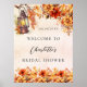 A welcome poster for a Bridal Shower. A blush pink gradient background. Decorated with a vintage lantern and orange flowers. Personalise and add a date and name.