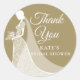 Gold and white elegant lace gown bridal shower thank you, classic round sticker featuring a bride wearing an elegant lace wedding gown on a gold background with a beautiful script white text for your special bridal shower details. You can customise the background colour to coordinate with your wedding theme.