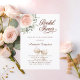 A chic white background. Decorated with a rose gold and blush pink floral, rose flower, greenery and a bow. Personalise and add the name of the bride to be and party details.