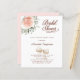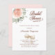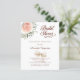 A chic white background. Decorated with a rose gold and blush pink floral, rose flower, greenery and a bow. Personalise and add the name of the bride to be and party details.
