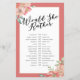 Bridal Shower fun Would She Rather game. Personalize this two-sided game sheet by adding the bride's name and shower date. Please check out the entire collection to see other matching items.