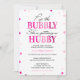 This modern bridal shower invitation features a pink magenta background with metallic confetti. The text is written in a mix of a playful calligraphy font and a modern serif font.