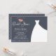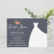 Wedding or Bridal shower invitation, with elegant floral bouquet and a beautiful wedding gown on a navy blue background with pink coral peach flowers.
