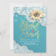 Bridal Shower invitations Template - Elegant Sunflowers, Vintage Lace Frame and Chic String Lights on Teal/ Turquoise/ Tiffany Blue Background.