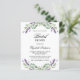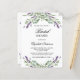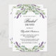 A white background. Decorated with violet lavender flowers and eucalyptus greenery. Personalise and add a name and party details. The name is written with a hand lettered style script.