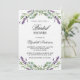 A white background. Decorated with violet lavender flowers and eucalyptus greenery. Personalise and add a name and party details. The name is written with a hand lettered style script