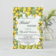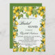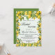 A green watercolored background. Decorated with yellow lemons and green foliage. Personalise and add a name and party details. The name is written with a hand lettered style script.